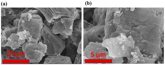 However, other diffraction peaks at 2theta value of 34.15°, 36.83°, 41.96°, 47.61°, 52.67°, 56.88°, 60.71°, 65.97°, 70.93°, and 74.54° correspond to (101), (103), (105), (107), (108), (109), (110), (1011), (1012), and (118) diffraction planes of Ti3AlC2 MAX, respectively. This P-XRD pattern and diffraction planes are in good agreement with the reported JCPDS-number 052-0875. The presence of strong diffraction peaks with high intensity indicates the presence of a good crystalline nature while the absence of any additional diffraction peak related to the impurities suggests a high degree of phase purity. Surface morphological properties also play a key role in determining the electrochemical sensing performance. Therefore, it is important to examine the surface morphological characteristics of the Ti3AlC2 MAX. The obtained SEM images are displayed in Figure 2a,b. The SEM results show that Ti3AlC2 MAX has a flake-like structure that forms the sheets.