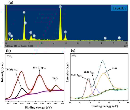 (a) EDX spectrum of the Ti3AlC2 MAX. (b) Ti2p and (c) Al2p XPS scan of Ti3AlC2 MAX.