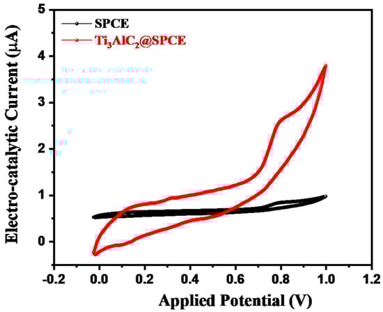 After physiochemical characterization of the Ti3AlC2 MAX, a based sensor was fabricated using Ti3AlC2 MAX as a catalyst to facilitate electron transport during the oxidation of hydrazine. The carbon-based bare surface of the SPCE was modified with Ti3AlC2 MAX as an electrocatalyst via drop-casting the dispersion (8 µL) of the Ti3AlC2 MAX. Cyclic voltammetry (CV) is one of the basic electrochemical techniques to study the electrochemical behavior or properties of the modified electrodes in a particular analyte. Thus, it is important to study the electrochemical behavior of the bare SPCE and Ti3AlC2@SPCE for the oxidation of hydrazine (Hz). In this context, the CV approach was utilized for the electrochemical oxidation of Hz. In the first step, the CV of the bare SPCE was recorded for the electrochemical oxidation of 55 µM Hz under the 0.1 M PBS conditions (pH = 8.0) at the applied scan potential rate of 50 mVs−1, as shown in Figure 4 (black color pattern).