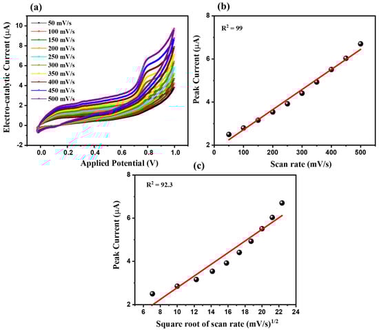 The applied scan rate of the electrochemical setup may affect the current responses of the working electrode toward the diffusion or adsorption of the analyte at a particular potential. The CV response of the Ti3AlC2@SPCE was recorded in the presence of 55 µM Hz under the 0.1 M PBS conditions (pH = 8.0) at different applied scan potential rates (50 mVs−1, 100 mVs−1, 150 mVs−1, 200 mVs−1, 250 mVs−1, 300 mVs−1, 350 mVs−1, 400 mVs−1, 450 mVs−1, and 500 mVs−1). The obtained CV results at different applied scan rates are summarized in Figure 5a, which shows that the current response of the Ti3AlC2@SPCE increases as the applied scan rates.