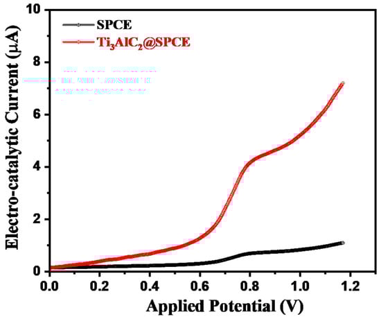 Therefore, we have used the LSV approach to further the sensing platform for the electrochemical oxidation of Hz. The LSV patterns of the bare SPCE and Ti3AlC2@SPCE were collected in the presence of 55 µM Hz under the 0.1 M PBS conditions (pH = 8.0) at the applied scan potential of 50 mVs−1. The obtained LSV results are given in Figure 6. It can be clearly observed that bare SPCE has a poor current response signal for the electrochemical oxidation of Hz. In the case of the electrochemical oxidation of Hz using Ti3AlC2@SPCE, an improved LSV signal is observed, as shown in Figure 6. This indicates that Ti3AlC2@SPCE exhibits higher catalytic features in the electrochemical oxidation of Hz compared with SPCE under similar conditions.