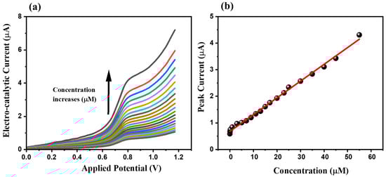 (a) LSV graphs of the Ti3AlC2@SPCE in the presence of different concentrations (0.01 µM, 0.08 µM, 0.25 µM, 1 µM, 3 µM, 5 µM, 7 µM, 9 µM, 11 µM, 13 µM, 15 µM, 17 µM, 20 µM, 23 µM, 25 µM, 30 µM, 35 µM, 40 µM, 45 µM, and 55 µM) of Hz under the 0.1 M PBS conditions (pH = 8.0) at the applied scan potential of 50 mVs−1. (b) The calibration plot shows the linear relation between the oxidation peak current response and the concentration of Hz.