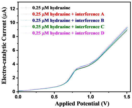 In the present world, various similar electro-active materials and compounds exist, which may affect the accurate detection of Hz. Therefore, a sensor should possess selectivity for a specific analyte. Since a three-electrode assembly operates in a liquid electrolyte system, the presence of other electro-active materials may impact the precise determination of Hz using Ti3AlC2@SPCE. In this context, we investigated the selectivity studies using the LSV method. The standard solutions of the electro-active materials were prepared in four batches (A= dopamine (DA), uric acid (UA), citric acid (CA), glucose, urea); B = (H2O2, ammonia, 4-chlorphenol, 4-nitrophenol, cholesterol), C= (Na+, Cl−, Mg2+, Cd2+, Hg2+) and D = (catechol, methanol, acetone)). The LSV responses of the Ti3AlC2@SPCE were obtained in the presence of 0.25 µM Hz, 0.25 µM Hz + 1 µM interference A (DA, UA, CA, glucose, urea), 0.25 µM Hz + 1 µM interference B (H2O2, ammonia, 4-chlorophenol, 4-nitrophenol, cholesterol), 0.25 µM Hz + 1 µM interference C (Na+, Cl−, Mg2+, Cd2+, Hg2+), and 0.25 µM Hz + 1 µM interference D (catechol, methanol, acetone) under the 0.1 M PBS conditions (pH = 8.0) at the applied scan potential of 50 mVs−1. Figure 8 shows that the presence of various interfering materials did not significantly affect the performance of the Ti3AlC2@SPCE and suggests its selective properties for the detection of Hz.