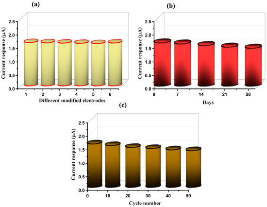 Reproducibility, repeatability, and storage stability are the most desirable features in electrochemical sensors. To evaluate these aspects, six different SPCEs were fabricated under similar environments and optimized conditions. Their performance was investigated for 0.25 µM Hz under the 0.1 M PBS conditions (pH = 8.0) at the applied scan potential rate of 50 mVs−1. It can be seen from Figure 9a that there is hardly a noticeable change observed, which suggests its good reproducibility. The Ti3AlC2@SPCE also showed good storage stability of 28 days as shown in Figure 9b. The repeatability study also investigated 0.25 µM Hz under the 0.1 M PBS conditions (pH = 8.0) at the applied scan potential rate of 50 mVs−1. Figure 9c demonstrates the presence of good repeatability for 50 cycles.