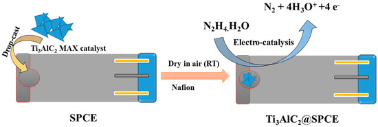 The Ti3AlC2 MAX (3 mg/mL) was sonicated in deionized water (DI) for a few hours to obtain the homogenous dispersion of the Ti3AlC2 MAX. Nafion (binder), 0.5 wt%, was added to the Ti3AlC2 MAX dispersion and sonicated for another 1 h. The bare active surface of the SPCE was modified using Ti3AlC2 MAX as electrode material. Different amounts of Ti3AlC2 MAX dispersion (4 µL, 6 µL, 8 µL, and 10 µL) were drop-cast onto the active surface of the SPCE and let dry for a few hours. 7.5 µL of the glucose oxidase was also coated on the fabricated electrode to improve the catalytic activity. The Ti3AlC2 MAX modified (after drying process) was used as a working electrode for electrochemical sensing application. In the paper, the Ti3AlC2 MAX modified SPCE electrode was denoted as Ti3AlC2@SPCE. The surface modification and operation of the Ti3AlC2@SPCE for hydrazine sensing are illustrated in Scheme 1 below.