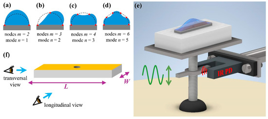 - Temperton, R.H.; Sharp, J.S. Vibrational modes of elongated sessile liquid droplets. Langmuir 2013, 29, 4737–4742. [Google Scholar] [CrossRef] [PubMed]