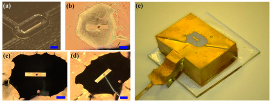 (a) Brass master copy of the individual post produced by micro-milling, to be used as a mold. (b) Gold layer on the PDMS post with vertical walls protected by NOA 61 adhesive. (c,d) Post with NOA 61 peeled off; the thin tube for water infusion can be observed through transparent PDMS in (d). All scale bars, indicated in blue, correspond to 1 mm. (e) Overview of the PDMS post glued to a microscope glass slide.