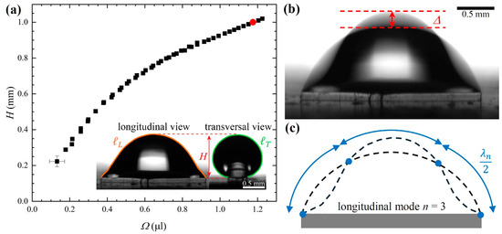 The graph in Figure 3a displays the maximum height H of the drop, measured from the upper face of the post, as a function of . The inset displays the two orthogonal views of the drop corresponding to the red circle indicated on the graph. As expected, H continuously increased with because the aspect ratio of the post was much smaller than the critical value = 16, above which a discontinuous transition from a filament to the bulge state is predicted [15]. Furthermore, the use of a short post, that is, , guarantees that no morphology transition from the filament to the bulge state can be induced by applying vertical vibrations to the substrate [20]. Consequently, vibrating the post can only excite the normal modes of the drop pinned to its rectangular perimeter.