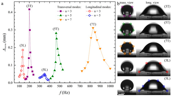 The y-axis reports the vertical displacement normalized to the vertical acceleration according to: , where is the acceleration corresponding to the resonance mode n and is the reference acceleration corresponding to the amplitude , used to scan the lowest frequency mode. Each curve was identified with a label that reported the mode number n followed by the letter L (T), which stands for longitudinal (transversal). As expected, the vibrational spectra of the first two modes exhibited two closely spaced peaks, which corresponded to standing waves that exist along the major and minor contour lengths of the drops [32]. This interpretation was confirmed by the analysis of the two corresponding orthogonal views, which are shown in the (b) panels (see also Supplementary Video S1 taken at about 20 fps and with an exposure time of about 20 ms). In the different snapshots, the nodes are highlighted with empty circles. The modes were then labelled T (L) if the nodes appeared in the transversal (longitudinal) views. Only odd modes were observed because the drops underwent vertical vibrations. Instead, even modes (“rocking” modes) could only be excited by lateral vibrations.