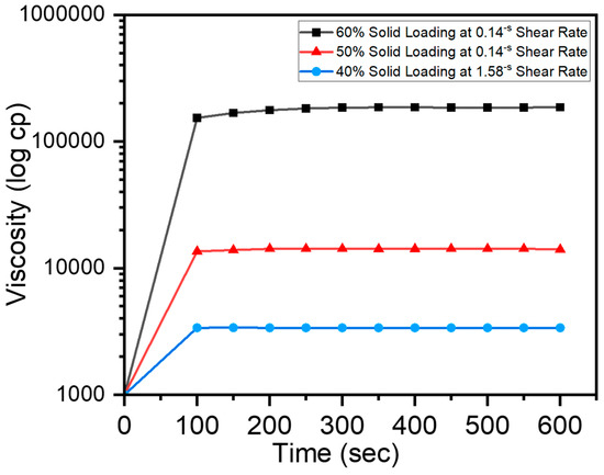 Due to its high viscosity, the slurry with a 60% solid load stabilized in 300 s. On the other hand, due to their diminished viscosities, the slurries encompassing 50% and 40% of the solid load attained stability after 200 s. The times required to reach stable viscosity rates for slurries holding 60%, 50%, and 40% solids, respectively, are shown in Figure 2. As all these measurements were obtained at the constant temperature of 22.4 °C, it is obvious that the viscosity of each slurry remained constant throughout the experiment.