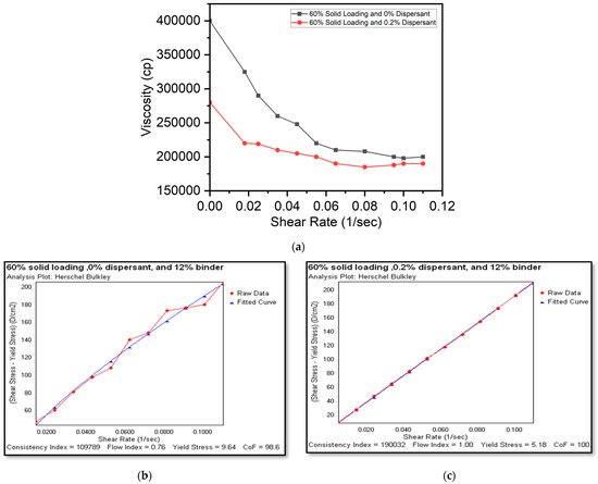 (a) Viscosity and shear rate plot for 60% solid loadings and a shear rate and shear stress plot (Hershel–Bulkley analysis plot) for slurries with a 60% solid loading and a 12% binder with (b) a 0% dispersant (viscoplastic) and (c) a 0.2% dispersant (Bingham).