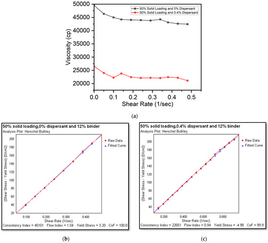 (a) Viscosity and shear rate plot for 50% solid loadings and a shear rate and shear stress plot (Hershel–Bulkley analysis plot) for slurries with a 50% solid loading and a 12% binder with (b) a 0% dispersant (Bingham) and (c) a 0.4% dispersant (pseudoplastic).