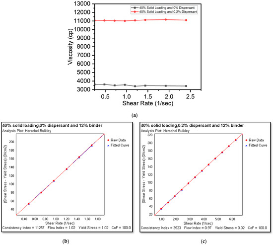 (a) Viscosity and shear rate plot for 40% solid loadings and a shear rate and shear stress plot (Hershel–Bulkley analysis plot) for slurries with a 40% solid loading and a 12% binder with (b) a 0% dispersant (Newtonian) and (c) a 0.2% dispersant (Newtonian).