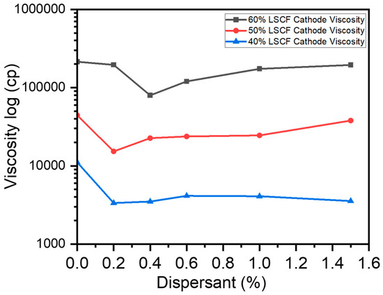 Viscosities of different LSCF solid loading slurries vs. dispersant concentration.