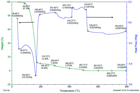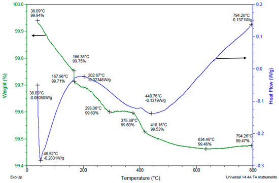 The sintering temperature curve was determined by the binder removal research study. Figure 7 illustrates the Thermo Gravimetric Analysis (TGA) and Differential Scanning Calorimetry (DSC) data for PVB drying at a 5 °C/min heating rate from room temperature to 800 °C. The TGA shows the changes in the weight of a specimen while its temperature is increased. The black curves represent the heating cycle from room temperature to 800 °C and a corresponding loss in binder mass at each temperature data point. DSC is a thermodynamical tool for direct assessment of the heat energy uptake, which occurs in a sample within a regulated increase or decrease in temperature. The markings in DSC graph (blue line) show both exothermic (heat-releasing) and endothermic (heat-absorbing) reactions occurring within the slurry mixture at different temperatures showing phase change in the materials and evaporation of the dispersant. An endothermic process was liable for the notable 87% mass loss that was seen at temperatures between 150 °C and 200 °C. Both endothermic and exothermic reactions were associated with the binder removal process between 200 °C and 600 °C, which led to the residue-free breakdown of the final 10% of the mass. The mass did not vary between 600 °C and 800 °C, indicating that the binder was wholly eliminated. These outcomes concur with Kim’s group research study [22].