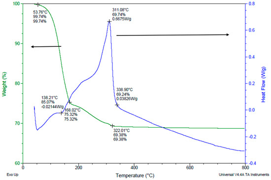 The experimental results of the drying process using TGA and DSC investigations are illustrated in Figure 8. The LSCF slurry, which has a 60% solid content, a 12% binder, and a 1.5% dispersant, was dried at temperatures as high as 800 °C. Between 50 °C and 150 °C, a significant amount of the overall mass, roughly 83%, vanished. Exothermic reactions caused a continuous mass loss of approximately 20% between temperatures of 150 °C and 350 °C. The mass remained stable above 350 °C and an endothermic process occurred. There are noticeable differences in the way the binder is eliminated when blended with LSCF powder when comparing Figure 7 and Figure 8. To be more specific, Figure 8 illustrates that the slurry released a significant quantity of heat in the 150–300 °C region. With a boiling point of about 219 °C at 100 kPa, the solvent (α-terpineol) may have vaporized, which could be the cause of this event.