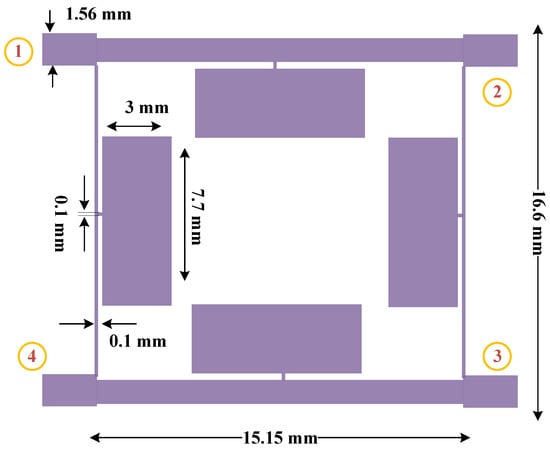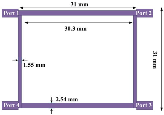 The structure of the proposed 90-degree hybrid coupler is illustrated in Figure 11. The final dimensions of the designed 90-degree hybrid coupler are 16.6 mm × 15.15 mm, which provides a size reduction of 73% compared to the dimensions of a common coupler (31 mm × 31 mm) at the same frequency of 1800 MHz.
