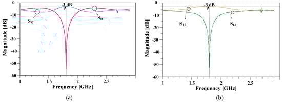 As seen in Figure 2, for a signal radiated from port 1, at the working frequency, no signal should be re-radiated to port 1 and no part of the signal should be transferred to port 4, so the values of S11 and S14 should be very small. On the other hand, a signal radiated from port 1 will be divided into two equal parts. Half of the signal will be transferred to the second port, and the other half should be transferred to the third port, so the values of S13 and S12 should be equal to −3 dB. As shown in Figure 2, the values of S13 and S12 are −3 dB at the operating frequency of 1800 MHz.
