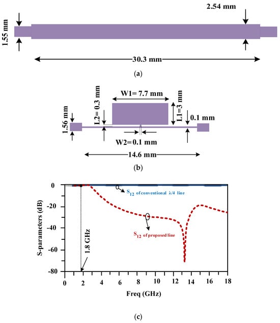In a common 90-degree hybrid coupler, four 90-degree lines are used. The structure of the long conventional horizontal line is illustrated in Figure 3a at the working frequency of 1800 MHz. The length of this line with the mentioned substrate is equal to 30.3 mm, and the width of this line is equal to 2.54 mm. Figure 3b shows the structure of the proposed line with a much shorter length of 14.6 mm. Both lines have similar responses at the working frequency of 1800 MHz, which are shown in Figure 3c.