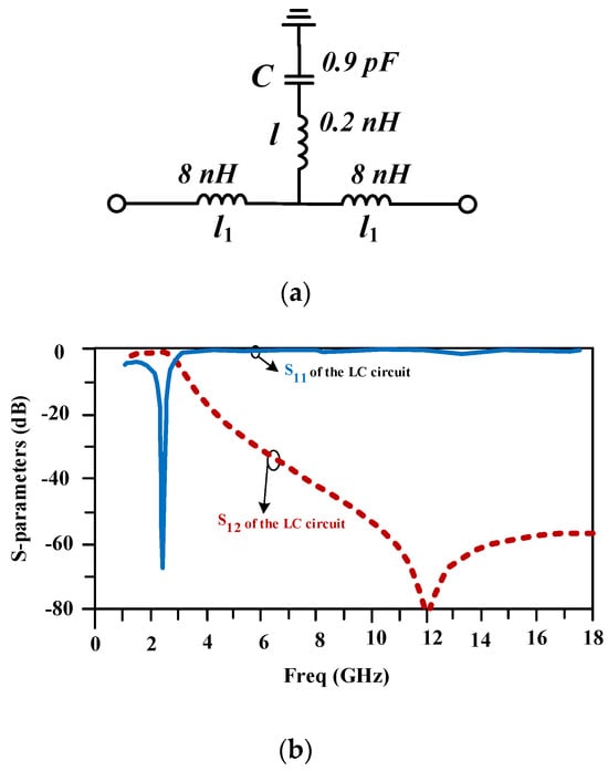 The lumped-element equivalent circuit of the compact proposed line is depicted in Figure 4a. This circuit includes two 8 nH inductors, which are located at the input and output ports, as well as a series inductor and a capacitor with values of 0.2 nH and 0.9 pF. The scattering parameters of the provided lumped-element equivalent circuit are drawn in Figure 4b and are similar to the frequency response of the proposed line.