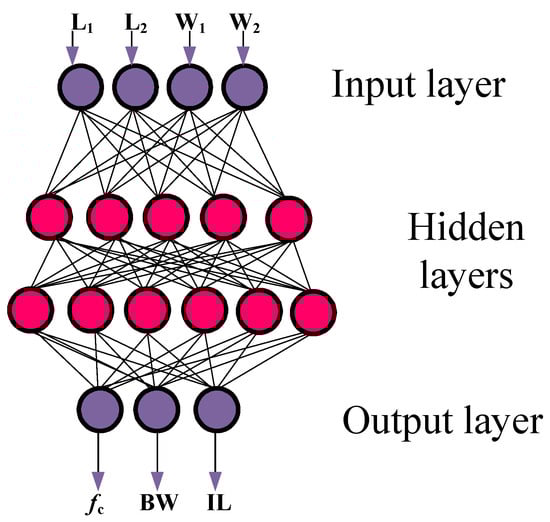 Figure 6 illustrates the designed MLP configuration for the applied artificial neural network. In this model, the cut-off frequency (fc), stopband bandwidth (BW), and insertion loss (IL) are considered the outputs of the network. Also, L1, L2, W1, and W2, which are shown in Figure 3b, are considered the inputs of the network.