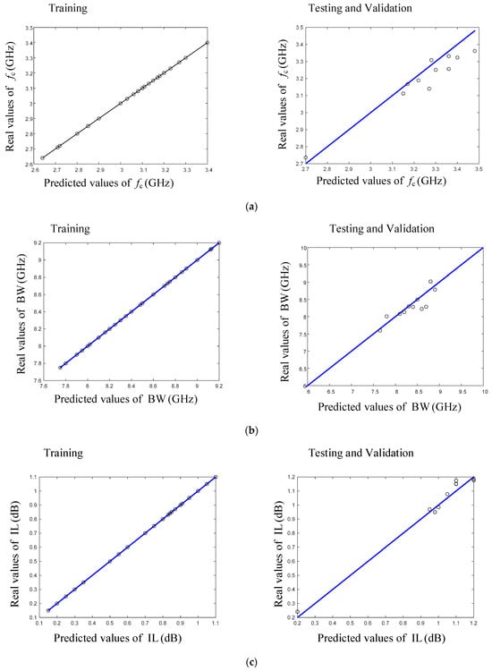 Comparison between predicted and real values of (a) fc (GHZ), (b) BW (GHZ), and (c) insertion loss (dB) for testing and training data using proposed ANN model.