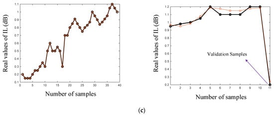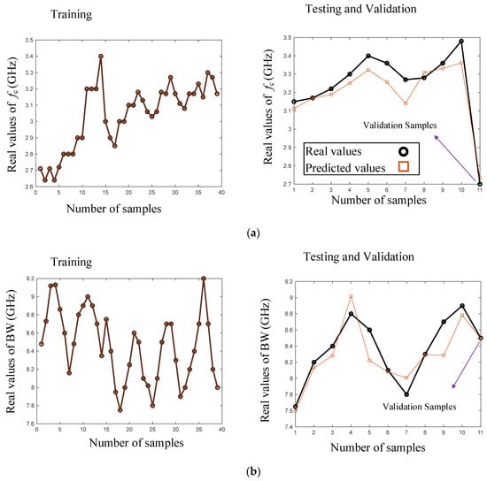 Figure 8 displays a comparison between the predicted and real values of the parameters fc (GHz), BW (MHz), and insertion loss (dB) for both the testing and training datasets in the selected neural network model. The accuracy of the predicted circuit parameters was evident, and the validation sample further confirmed the accuracy of the designed model. As shown in Figure 8, the 39 samples used for the training procedure trained the model accurately. Also, the predicted values of the 10 test samples had acceptable accuracy for all of the LPF outputs. As seen in the figure, the predicted values for insertion loss (IL) and bandwidth (BW) were more accurate than the predicted values for the cut-off frequency (fc). However, the validation sample was used for the design and fabrication of the LPF. The predicted values for the validation sample are also shown in Figure 8 for all of the LPF outputs, which had high accuracy.
