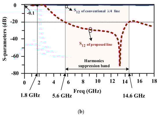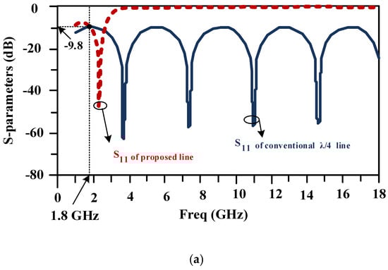 A scattering parameter comparison between a typical line and the proposed compact line is illustrated in Figure 9a,b. Both lines have the same response at a frequency of 1.8 GHz. The conventional line has no harmonic elimination, but the proposed line has a wide stopband from 5.6 to 14.6 GHz, which shows the proper performance of the above line with much smaller dimensions. As seen in the figure, the proposed line acts as an LPF with a cut-off frequency of 2.7 GHz, which allows signals from DC to 2.7 GHz to pass and suppresses signals at higher frequencies. As seen in Figure 9, the value of S11 in the pass band is less than 9 dB and the value of S21 is near 0 dB (0.1 dB) for both the conventional and proposed lines, which is acceptable.