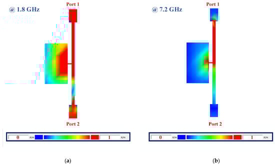 Figure 10 depicts the current distributions of the applied low-pass filter at 1.8 GHz and 7.2 GHz. The applied LPF has a cut-off frequency of 2.7 GHz, while the designed coupler is working at 1.8 GHz. As shown in Figure 10a, the signal coming from port 1 correctly passes to port 2. Also, the proposed LPF provides a wide rejection band from 5.6 to 14.6 GHz with more than 20 dB of attenuation. As seen in Figure 10b, the signal coming from port 1 at 7.2 GHz, which is located in the stopband, does not pass to port 2.