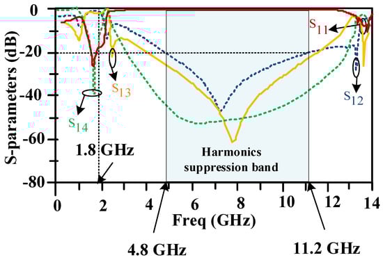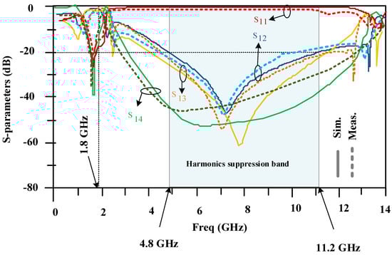 The measured and simulated frequency responses of the proposed 90-degree hybrid coupler are presented in Figure 15. There is good agreement between the simulations and measurements. The measurements confirm the simulations. The proposed coupler has good performance at 1.8 GHz. Also, the proposed coupler provides a wide harmonics rejection band in a frequency range from 4.8 GHz to 11.2 GHz.