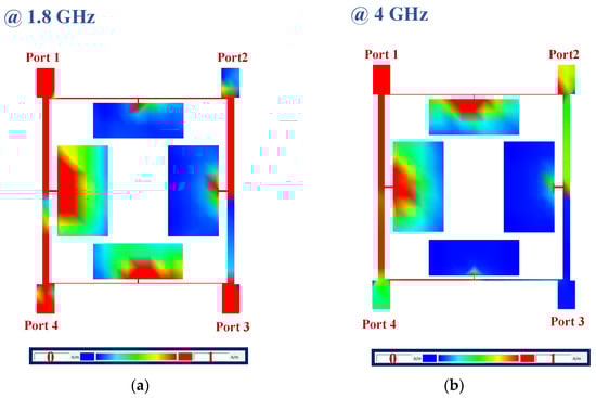In Figure 13, the current distributions of the designed 90-degree hybrid coupler at 1800 MHz and 4 GHz are depicted. The proposed 90-degree hybrid coupler operates at 1800 MHz and provides a rejection band from 4.8 to 11.2 GHz. As shown in Figure 13a, the signal coming from port 1 at 1800 MHz correctly passes to port 2 and port 3, while no signal is transmitted to port 4. Additionally, as seen in Figure 13b, the signal coming from port 1 at 4 GHz, which is located in the stopband, does not pass to port 2 or port 3.