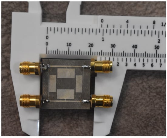 The designed 90-degree hybrid coupler was fabricated on an RT duroid 5880 Rogers substrate, and a photo of the designed coupler is presented in Figure 14. The final dimensions of the coupler are only 16.6 mm × 15.15 mm, which is a size reduction of 73% compared to the dimensions of a common coupler (31 mm × 31 mm) at a working frequency of 1800 MHz. The simple planar structure of the microstrip coupler allows for easy fabrication without the need for additional processes.