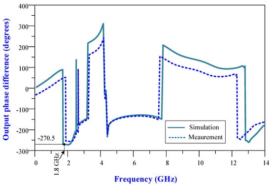 The measured and simulated output phase curves of the 90-degree hybrid coupler are illustrated in Figure 16. The output phase difference at 1.8 GHz is −270.5 degrees, which is 0.5 degrees out of phase.
