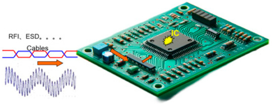 - Lafon, F.; de Daran, F.; Ramdani, M.; Perdriau, R.; Drissi, M. Immunity Modeling of Integrated Circuits: An Industrial Case. IEICE Trans. Commun. 2010, E93.B, 1723–1730. [Google Scholar] [CrossRef]