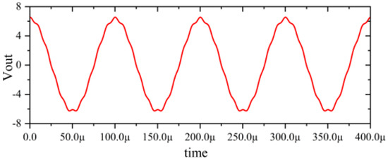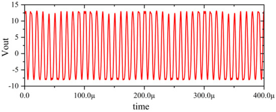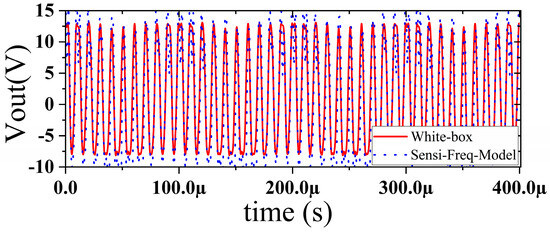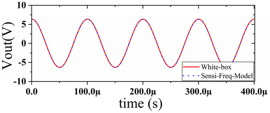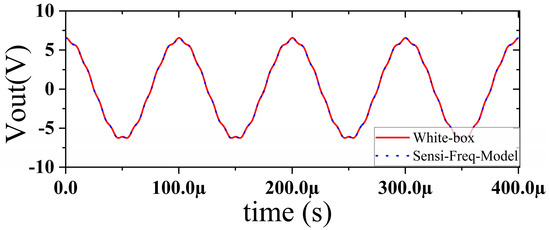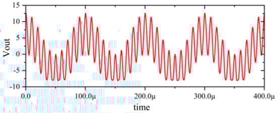 In this section, a method for extracting immunity models using chip-simulated circuits is presented and the accuracy of the Sensi-Freq-Model is verified. An analog circuit model of an operational amplifier built based on white-box theory is used. The circuit structure and specific parameters are shown in Figure 3. This white-box model was built to extract the Sensi-Freq-Model and verify the difference between its output in the simulation software and the white-box model. The op-amp is a forward amplifier circuit, and the parameters set for normal operation are : , sine wave signal, and the DC bias voltage set to and . When the chip is in normal operation, the output of the circuit is as seen in Figure 4. Based on the DPI test method of IEC62132-4 [3], interference signals of different frequencies and powers are applied to the op-amp’s input ports and power supply ports. The interference signals are selected for continuous waveforms according to Section 5 of IEC 62132-4. Here, the interference noise signal is simulated using the signal source module (power source-N Frequencies and Power Levels) in the ADS (advanced design system). The output of the op-amp is shown in Figure 4, Figure 5, Figure 6 and Figure 7. Interference signals of different levels, when observing the output response sensitivity characteristics of the monitoring port, can be mainly divided into four phenomena (Table 1), which can be used to describe the faults as four types of situations according to the IC performance level specified in IEC62132-1 [25]. The specific description is shown in Table 1, and its output waveform schematic is shown in Figure 4, Figure 5, Figure 6 and Figure 7.