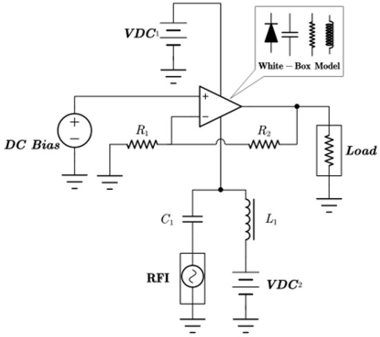 Extraction of the injected immunity model for the input terminal of Vin+. DC Bias is a DC source; R1 and R2 are resistors; Load is the matching load; Vin and RFI are the amplifier’s function signal and interference signal injection source; VDC is the DC voltage source for the amplifier.