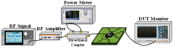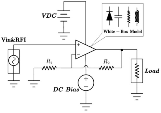 In this section, we will verify the accuracy of the methodology by obtaining a Sensi-Freq-Model immunity model of the device using actual instrumentation and performing immunity simulations using the model. An operational amplifier, which is more susceptible to sensitization, was chosen for testing and modeling. The amplifier was used in a voltage follower configuration [26], in which interference to the input differential pair may cause the amplifier output to be offset, making the amplifier inoperable [27]. In addition, of all the possible interference signals, those overlaid on the op-amp input pins are the most difficult to prevent [28]. The op-amp is powered by a ±2.5 V supply voltage, with the V+ pin set to 0 VDC. Interference signals are injected through a bias tee on this pin.