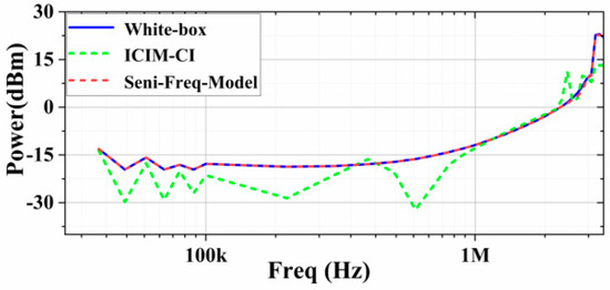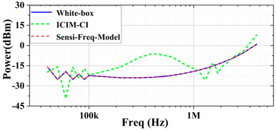As can be seen from the results displayed in the above section, the Sensi-Freq-Model can directly output the response waveform of the chip after being perturbed; therefore, it is only necessary to build broadband immunity prediction curves for different immunization standards after one test. Compared to the traditional ICIM-CI model, which needs to determine the immunity criteria before establishing the immunity prediction curves, the Sensi-Freq-Model does not need to be re-modeled due to the change in the test criteria, which will result in significant savings in overall modeling time. In this section, the immunity criterion is set to the condition that the allowable change in peak-to-peak output voltage ΔVoutp-p is ≤5% for comparison purposes, and Figure 14 shows the comparison of the results of using the method proposed in this paper and the traditional ICIM-CI modeling method with white-box simulation when interference is injected from the power supply side through the V- port. It can be seen that, under this immunity criterion, both modeling methods predict the sensitivity better because the chip has higher linearity.