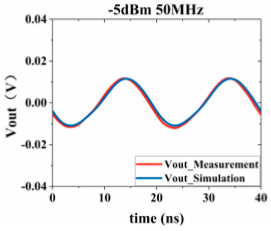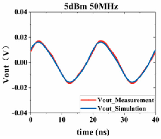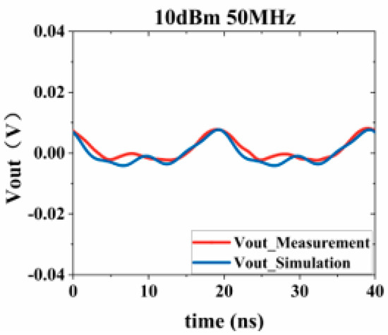 Substituting the test results into Equation (3), the response values of the Sensi-Freq-model of the chip at different power levels are obtained. The accuracy of the modeling method is verified by comparing the actual DPI test results of the board. Similarly, the comparison of the measured and simulated results of the frequency- and time-domain measurements at 50 MHz after inputting interference signals with different powers (Figure 19, Figure 20, Figure 21 and Figure 22) shows that the jitter of the chip’s output response increases as the input power is increased. When the input power is 10 dBM, the output signal is severely distorted, and the chip cannot work properly. It can be seen that the Sensi-Freq-Model can provide accurate output waveforms after disturbance, regardless of whether this disturbance is in the form of a small jitter or severe distortion.