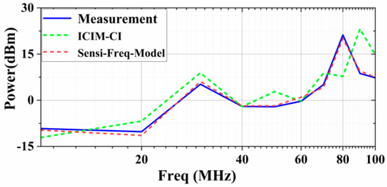 When injecting interference to Vin+ and setting ΔVoutp-p ≤ 5%, it can be seen that the prediction accuracy of the ICIM-CI model deteriorates when the system has a nonlinear response due to interference; in contrast, the Sensi-Freq-Model’s prediction accuracy is still relatively satisfactory (Figure 15).