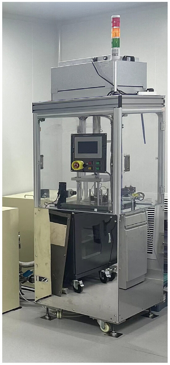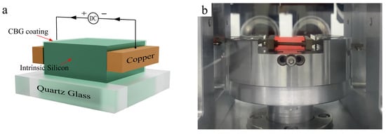 Firstly, a 200 nm thick layer of CBG networks was coated on the surface of the 18 × 18 × 11 mm intrinsic silicon mold core by CVD. The thickness of the CBG coating was determined by the reaction time and CVD growth temperature. It was found that a 150 nm layer of CBG coating could be formed on the silicon surface by CVD at a temperature of 980 °C and a reaction time of 30 min. The detailed process of the CVD method used to prepare the CBG coating has been described by Huang et al. [4]. The experiment was conducted using a customized non-isothermal glass hot embossing machine, as depicted in Figure 3. The CBG-coated silicon mold core was placed in the vacuum chamber of a specially designed non-isothermal glass hot embossing machine, which maintained a vacuum pressure of approximately 1 MPa (Figure 1b). The braid copper strips were connected to the CBG coated silicon as electrodes. Subsequently, an electric current was passed through the copper electrodes to silicon mold core from both sides, with the CBG coating serving as the electrical conductor and generating heat in accordance with Joule’s law. To prevent the dissipation of heat and electricity, the high electrical and thermal resistance quartz glass was used to insulate the CBG coated silicon from the surrounding environment. Furthermore, the quartz glass beneath the CBG coated intrinsic silicon served as a support structure.