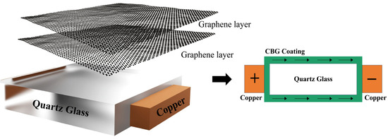 The CBG coating exhibits significantly higher conductivity than intrinsic silicon at room temperature [10]. Within the extrinsic region, where the surface temperature of the CBG coating ranges from 20 °C to approximately 60 °C, the carrier concentration remains nearly constant due to the energization of dopant carriers into the conduction band, resulting in minimal thermal generation of additional carriers. As a result, the resistance of the CBG-coated silicon exhibits a slightly fluctuating but constant behavior within this temperature range. However, upon application of an input current voltage and subsequent temperature increase, the extrinsic region transitions into the intrinsic region, supplying greater thermal energy to the intrinsic silicon and CBG coating. This leads to an exponential rise in the electrical conductivity of both the intrinsic silicon and the CBG coating, consequently generating a significant amount of Joule heat. To investigate the temperature-dependent electrical conductivity of a CBG coating, we deposited it on a quartz substrate with dimensions matching those of intrinsic silicon. By applying a current and voltage to both sides of the CBG coating (Figure 2), we heated it up to 700 °C and recorded its conductivity. Our experimental results showed that the CBG coating maintained a constant resistance of approximately 20 Ω throughout this process.