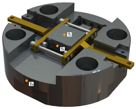There were three different online infrared thermometers to measure the surface temperature, which can be seen in Figure 4. An online infrared thermometer was placed at the center of the coating surface to measure the surface temperature of the glass sample (T1). Another online infrared thermometer (T2) was positioned at the middle of the mold core to record the temperature of the CBG-coated silicon. In addition, the surface temperature of the mold holder was measured by temperature (T3). Following the cold junction compensation, the online infrared thermometer signals were collected using a multi-channel data acquisition device with a sampling interval of 200 ms. In addition to temperature measurements, the data logger also recorded the heater voltage, heater current, mold temperature, vacuum pressure, mold displacement, and press force. To ensure the validity of the data, the entire heating and cooling process was performed multiple times.