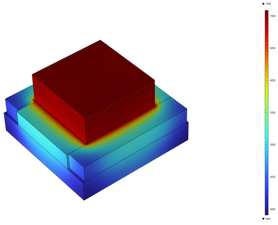where cp,s = (dscp,sρs + dgcp,gρg)/(ds + dg) and dsλs + dgλg)/(ds + dg), ds, cp,s, ρs, λs are the thickness (m), density (kg·m−3), thermal conductivity (W·m−1·K−1), and the specific heat capacity (J·kg−1·K−1) of silicon; dg, cp,g, ρg, λg are the thickness (m), density (kg·m−3), thermal conductivity (W·m−1·K−1), and the specific heat capacity (J·kg−1·K−1) of CBG coating; S1 is the is the cross-sectional area of the silicon mold core (m2); σSB is the Stefan–Boltzmann constant; S2 is the surface area of the silicon mold core (m2); λ is the heat transfer coefficient; S3 is the inner surface area of the chamber (m2); T0 is the air temperature in the chamber (K); T1 is the temperature of silicon mold core (K); Qj is the heat source of silicon mold core (W·m−3); ∇t is the tangential gradient operator; σs is the conductivity of silicon mold core (S·m−1); E is the electric field intensity of silicon mold core (V·m−1); ε0 is the dielectric constant of silicon mold (F·m−1); εr is the relative permittivity of silicon mold core; J is the current density of silicon mold. V is the electric potential of silicon mold core.