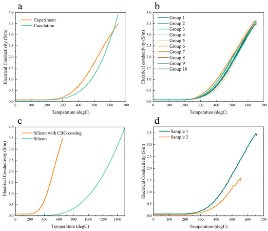 To identify differences in the electrothermal conversion characteristics between silicon and CBG-coated silicon, another experiment was conducted. As illustrated in Figure 6c, the temperature and electrical conductivity curves of the two materials did not coincide. When only silicon was used, the curve was drawn from the equation [11]. Below 400 °C, the electrical conductivity of silicon was very low, almost close to 0. But once the temperature exceeded 400 °C, the electrical conductivity of silicon rose rapidly. By comparing with the curve of CBG coated silicon, it was found that the electrical conductivity value of the one with CBG coating was already more than 0 from the beginning. Furthermore, its electrical conductivity began to increase rapidly at 200 °C, which was 200 °C earlier than it was for the condition of silicon. Additionally, the rate of increase in electrical conductivity with temperature was significantly faster for silicon with CBG coating than for silicon. This observation suggests that certain substances may have the potential to modify the electrical conductivity properties of silicon.