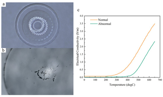 The glass hot embossing product was analyzed by metallographic microscopy (SOPTOP MX6R). Figure 8a shows the glass product in its normal condition, with a clean surface devoid of air bubbles. Its aspheric profile was in line with that of the silicon mold core, indicating that the surface profile of the mold core has been successfully transferred to the glass product’s surface. However, as the embossing process progresses, stains may start to emerge on the glass surface (Figure 8b). When we compared the electrical conductivity curve with temperature, shown in Figure 8c, we noticed that under abnormal conditions, the temperature for the rapid increase in conductivity was higher than under normal conditions. Subsequently, when comparing the CBG-coated silicon mold core surface, the stains on the glass product surface revealed the peeling of the CBG coating, indicating damage to the CBG coating. This observation was further supported by the alteration in the curve of electrical conductivity changes with temperature under abnormal conditions. If the CBG coating had not been damaged, the curve would align with that of the normal condition. The results reveal the potential for early detection of damage and assessment of the service life of CBG-coated silicon.