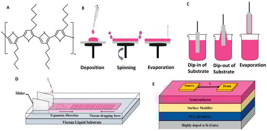 (A) Structure of RR-P3HT, (B) spin coating, (C) dip coating, (D) UFTM, and (E) schematic representations for OFET architecture.