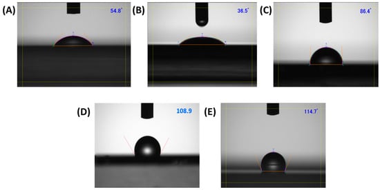 Contact angle of the glass substrate surface (A) untreated, (B) UV–ozone treated, (C) HMDS, (D) OTS, and (E) CYTOP.