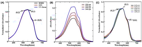 (A) Normalized absorption spectra for spin-coated RR-P3HT thin films on glass substrate treated with different surface modifiers, (B) absorption spectra at various spinning speeds, and (C) normalized absorption spectra of the films fabricated with varying polymer concentrations in chloroform.