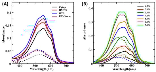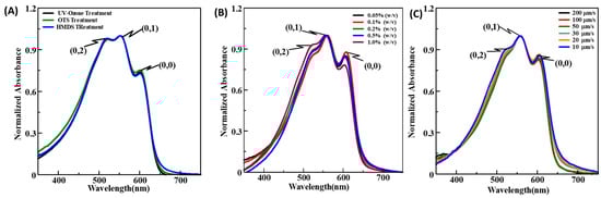 Dip coating for thin film fabrication was developed to prepare large-area uniform thin films, and for CPs, it offers the advantage of utilizing their inherent molecular self-assembly owing to extended π-conjugation. At the same time, it is also advantageous over spin coating in terms of material utilization. Parametric optimization such as the nature of the substrate surface, polymer concentration, and lifting speeds has to be performed to control the film uniformity and morphology. Electronic absorption spectra dip-coated thin films prepared on differently surface-modified glass substrates are shown in the Supporting Information (Figure S2A) while keeping the polymer concentration and lifting speed of 1% (w/v) and 20 µm/s, respectively. It was observed that dip-coated films have three distinct peaks A0-0, A0-1, and A0-2 occurring at wavelengths of 600 nm, 550 nm, and 510~520 nm, respectively, as shown in Figure 4A, and the respective values are given in Table 2. It has been widely reported that in RR-P3HT when the ratio of peak absorbances corresponding to A0-0/A0-1 is higher, it signifies enhanced crystallinity in the followed by HMDS suggesting slightly better molecular ordering in the thin films fabricated on OTS [34]. Despite this better ordering in the OTS-treated glass substrate, the film uniformity is inferior to that on the treated substrate, which can be seen from the photographic image shown in the Supporting Information (Figure S2B). Moreover, dip-coated films could not be fabricated onto CYTOP-treated surfaces (Figure S2B) due to the highly hydrophobic nature of CYTOP-treated substrates. Hence, for the dip-coating technique, HMDS surface treatment would be the most suitable as it results in a homogenous and uniform film without seriously affecting the molecular ordering in the fabricated thin film.